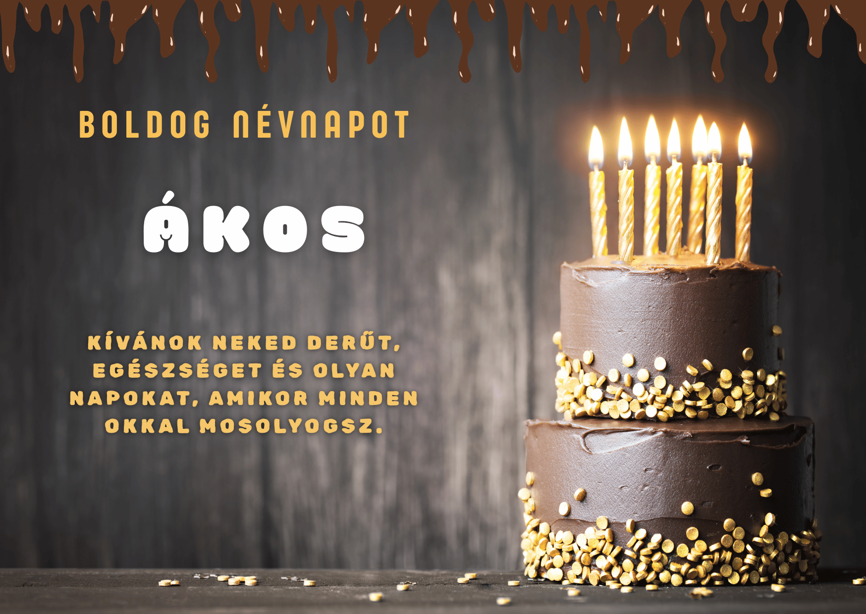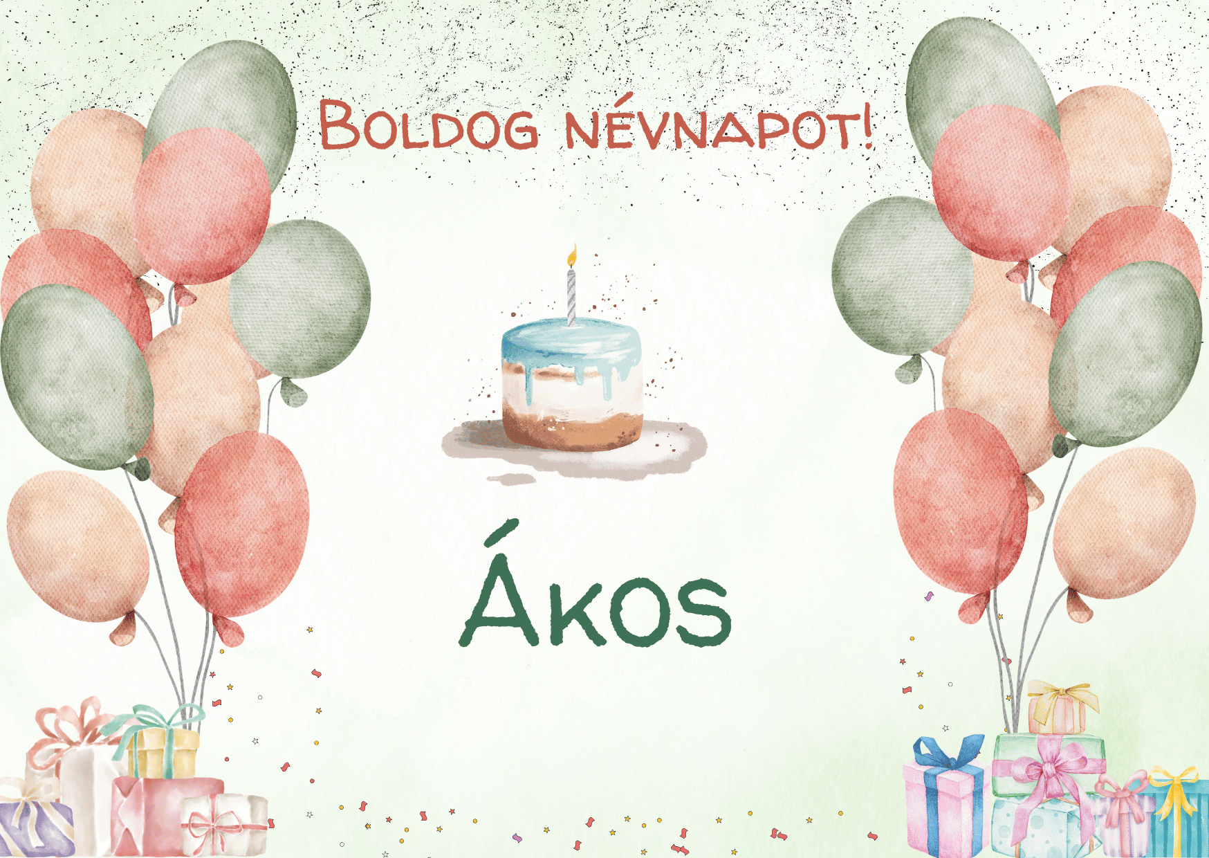 Boldog névnapot, Ákos! Kívánom, hogy minden terved szépen alakuljon, és sok siker érjen.